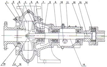 4、依次装上轴承体、轴承(4PW无)油封圏及垫圈、叶轮、垫片和叶轮螺母并拧紧,然后装上泵体和泵盖。