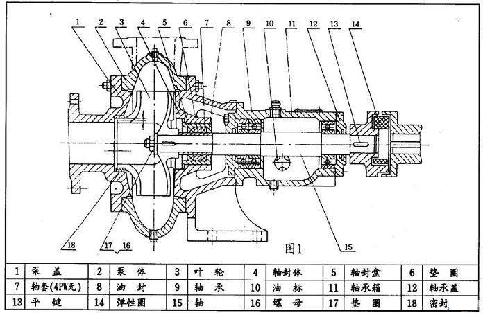 本型泵主要由:泵盖(1),泵体(2),叶轮(3),轴(15),轴封体(4),轴承箱(11))及联轴器部件等组成〈见图1:结构图〉